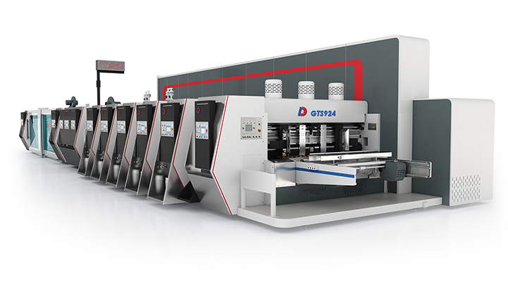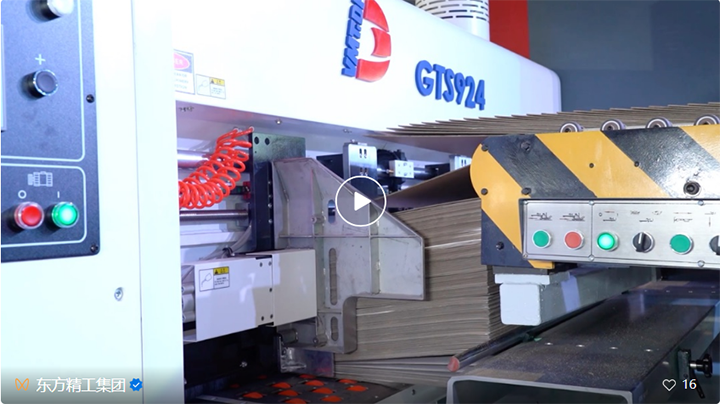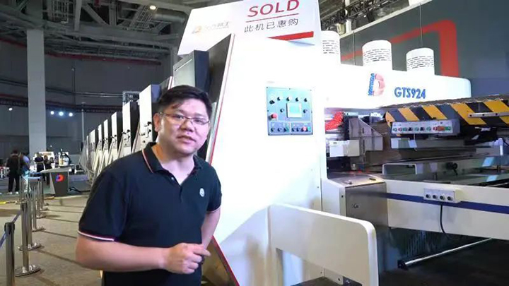 Corrface全瓦通罗旭峰:我们之前在永盛也拍过东方的GTS1228,这次展会发布的是GTS924,它是一条主要针对一些小型电商箱的联动线。它的送纸部可以说是行业标配的免压送纸。这台设备最大的亮点,我们之前也有介绍过,就是它整个传输不用真空箱,而是用大皮带的方式来传输。大皮带的好处在于:第一是省电,第二这对于如三层板、翘曲的纸板来说,它整个的适用性会更强。而且对于很多小型的纸板会更加的方便。