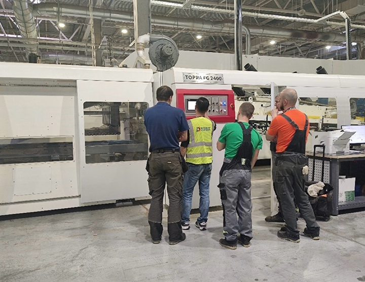 Engineers debug the gluing machine and train the personnel to operate it.